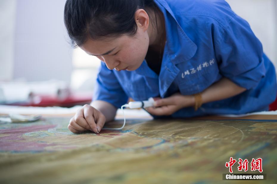5月14日,国际博物馆日前夕,在位于太原市的山西博物院文物保护中心,50余名文物修复师分别对大量的古代壁画、青铜器、书画进行精心修复,工作量繁重。中新社记者 韦亮 摄