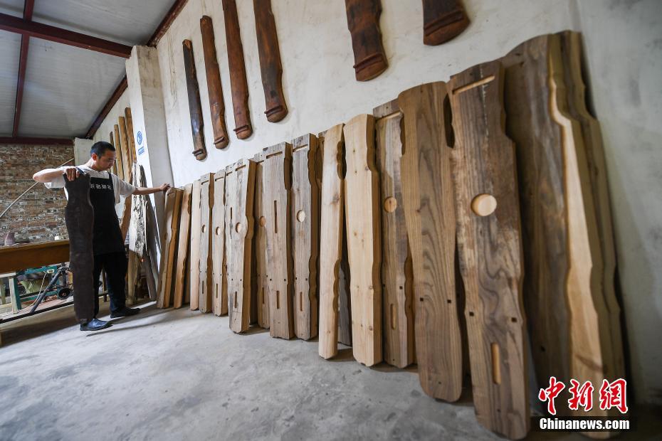 张浩介绍说,古法斫琴之所以耗时久,就是因为其过程的质朴与原始,以达到成琴后比较稳定不易开裂。图为斫琴师张浩整理其待加工制作的古琴。中新社记者 武俊杰 摄