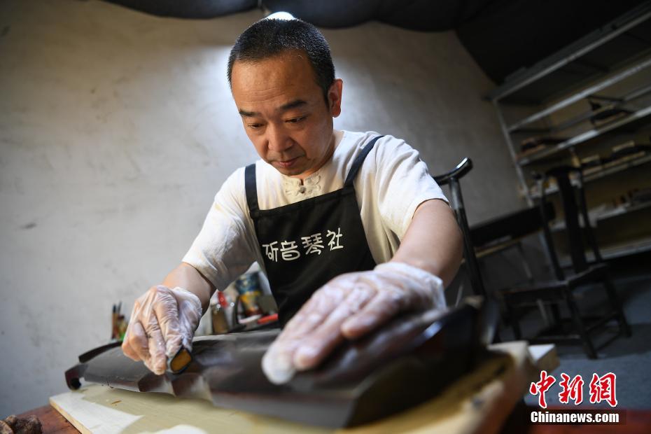 目前,张浩经常在太原的各个小学进行古琴义务教学,希望借此推广、传播古琴文化,让更多青少年了解古琴,成为古琴的传承人。图为斫琴师张浩打磨古琴表面。中新社记者 武俊杰 摄
