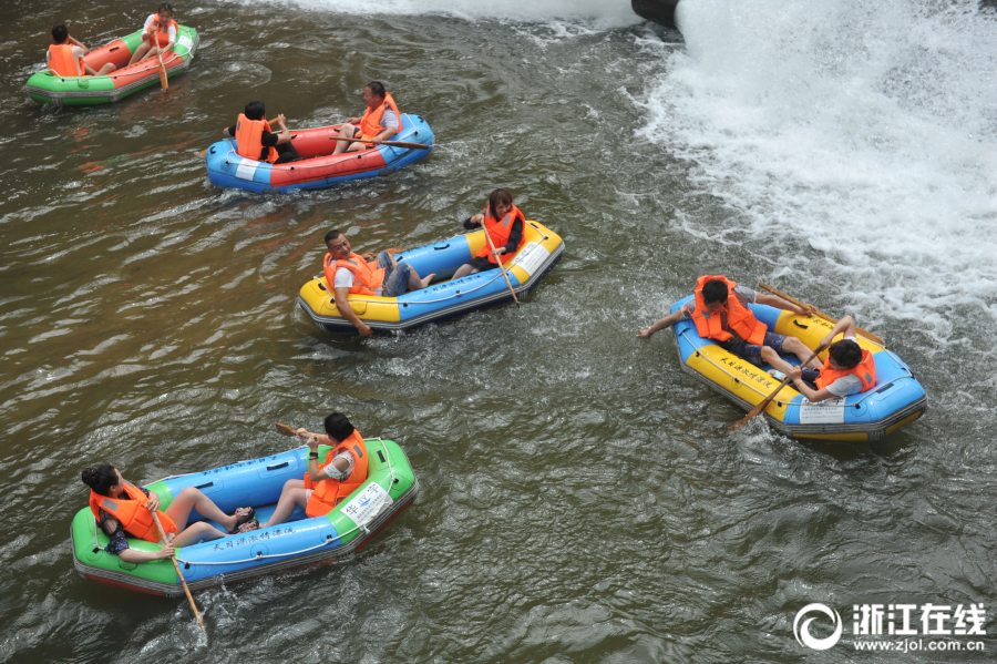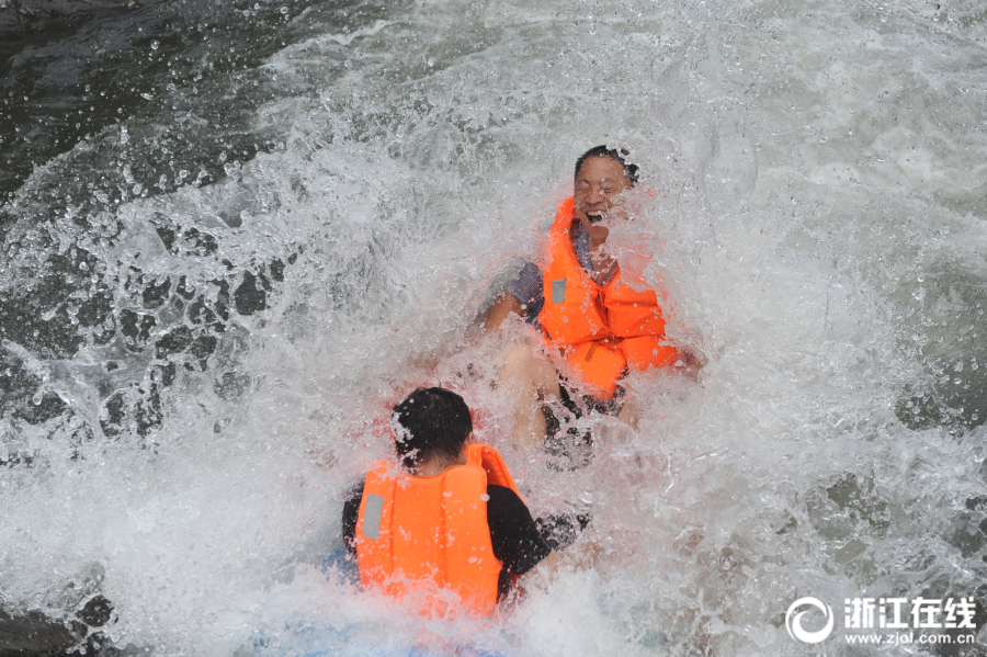 5月15日,游客在杭州市临安区漂流景点戏水漂流。随着高温天气来临,亲水漂流项目受到游客青睐,人们纷至沓来,享受清凉。(浙江在线拍友 胡剑欢 摄)