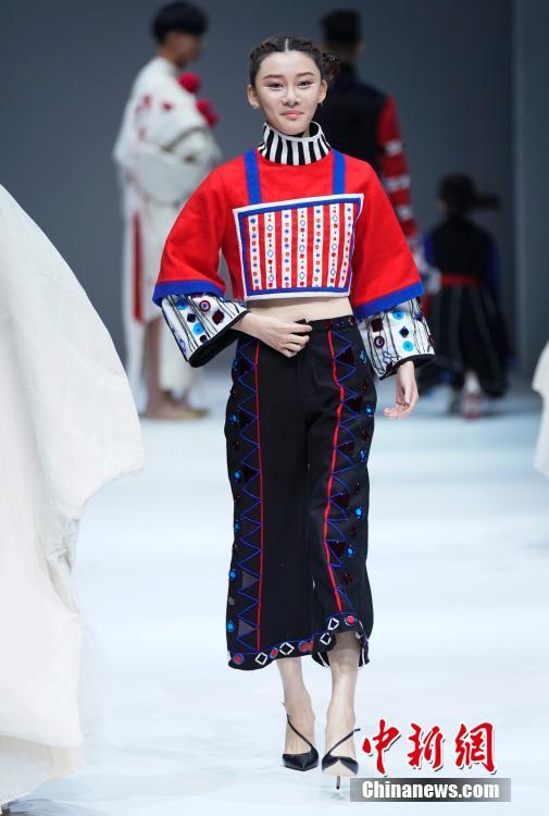 5月17日,中国国际大学生时装周在北京举行。图为2018江汉大学设计学院毕业生作品发布。本次展演作品汇集了服饰与服装设计和服装表演与设计专业2018届50名毕业生近70余套服装,整场秀较往年相比,展示的服装作品更注重创意思维。中新社记者 杜洋 摄