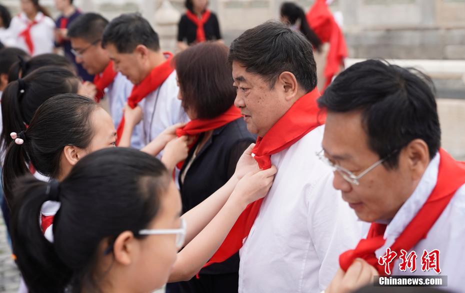 5月18日,国际博物馆日当天,来自北京市海淀区双榆树第一小学的240名学生走进北京故宫博物院,在太和门广场举行庄严的少先队入队仪式。图为少先队员为故宫博物院院长单霁翔戴上红领巾。中新社记者 杜洋 摄