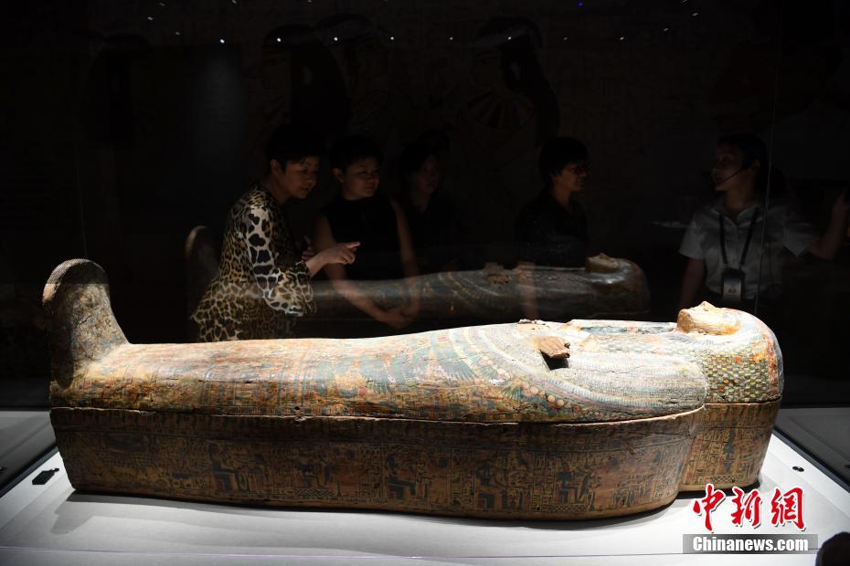 5月18日,安徽省博物院和意大利佛罗伦萨国立考古博物馆联合推出的“不朽之旅——古埃及人的生命轮回”特展亮相。图为在安徽省博物馆古埃及木乃伊特展上展出的“阿吉特兑彩绘木棺”。该木棺有女性形象棺盖和装饰着男性逝者形象的棺体组成。韩苏原 摄
