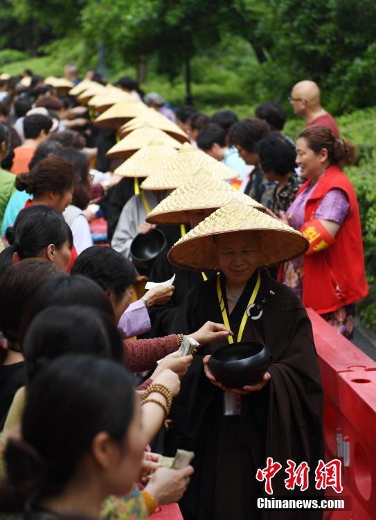 5月22日,众多僧人正在接受善信的供养。当日,系农历四月初八释迦牟尼佛诞辰吉日,浙江杭州市属各大寺院、杭州佛学院、灵隐寺等1000名僧人依照佛制,著衣持钵,头戴斗笠,进行托钵行脚活动。 中新社记者 王刚 摄