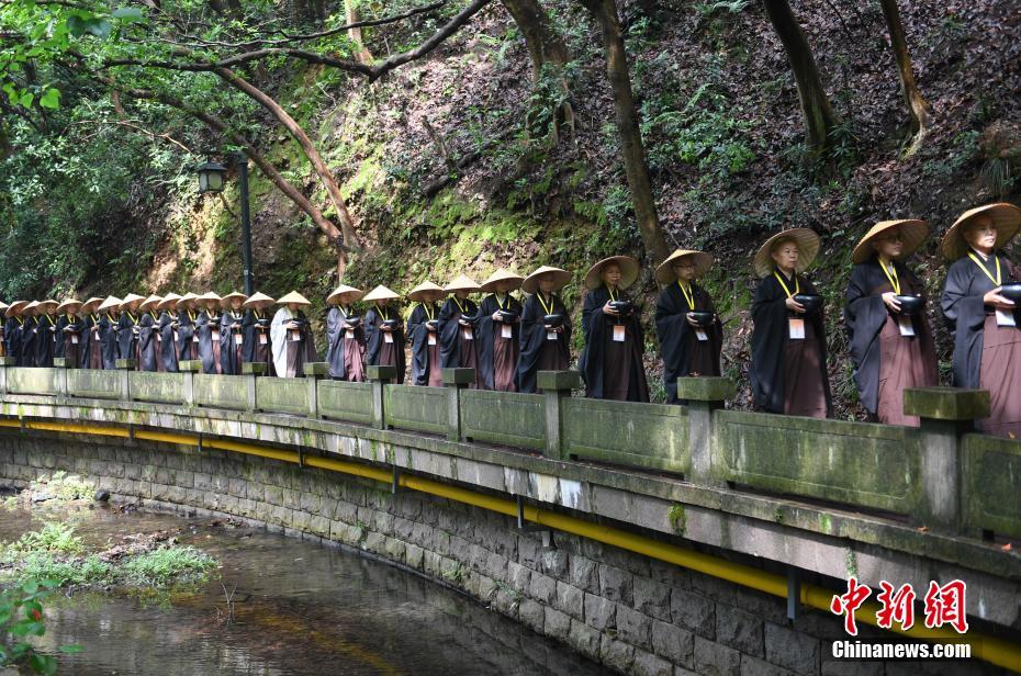 5月22日,众多僧人正在“托钵行脚”。当日,系农历四月初八释迦牟尼佛诞辰吉日,浙江杭州市属各大寺院、杭州佛学院、灵隐寺等1000名僧人依照佛制,著衣持钵,头戴斗笠,进行托钵行脚活动。 中新社记者 王刚 摄