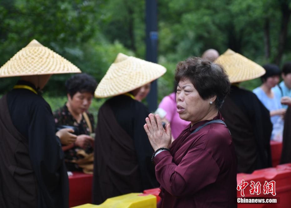 5月22日,一位信徒在僧人走过时诵经。当日,系农历四月初八释迦牟尼佛诞辰吉日,浙江杭州市属各大寺院、杭州佛学院、灵隐寺等1000名僧人依照佛制,著衣持钵,头戴斗笠,进行托钵行脚活动。 中新社记者 王刚 摄
