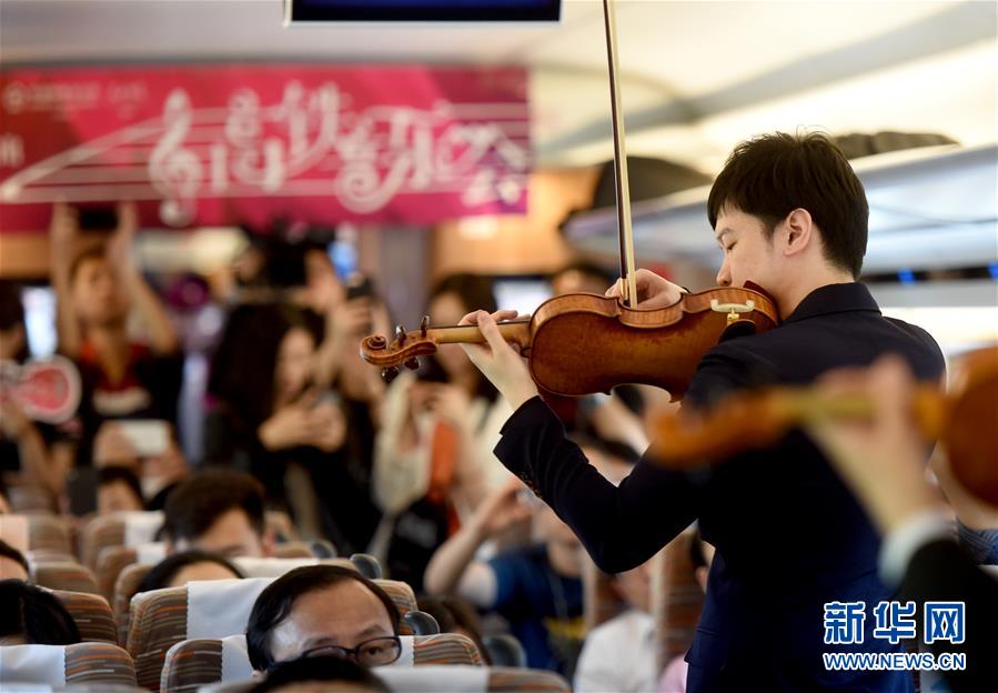 5月22日,小提琴演奏家在“复兴号”列车上为旅客演奏。新华社记者 罗晓光 摄