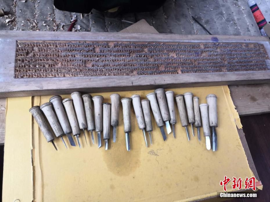朗加12岁时拜父亲为师,后拜古泽一带著名的木刻雕版艺人色培为师。25岁时已经成为一名熟练的刻版制作艺人。现在的他桃李满天下,他表示会很好地将波罗古泽刻板制作技艺传承下去,因为这不仅是一个民族的文化,更是中国的文化,他希望有更多的人了解这个文化。图为朗加向记者展示雕刻所使用的刻刀。中新网记者 吉翔 摄