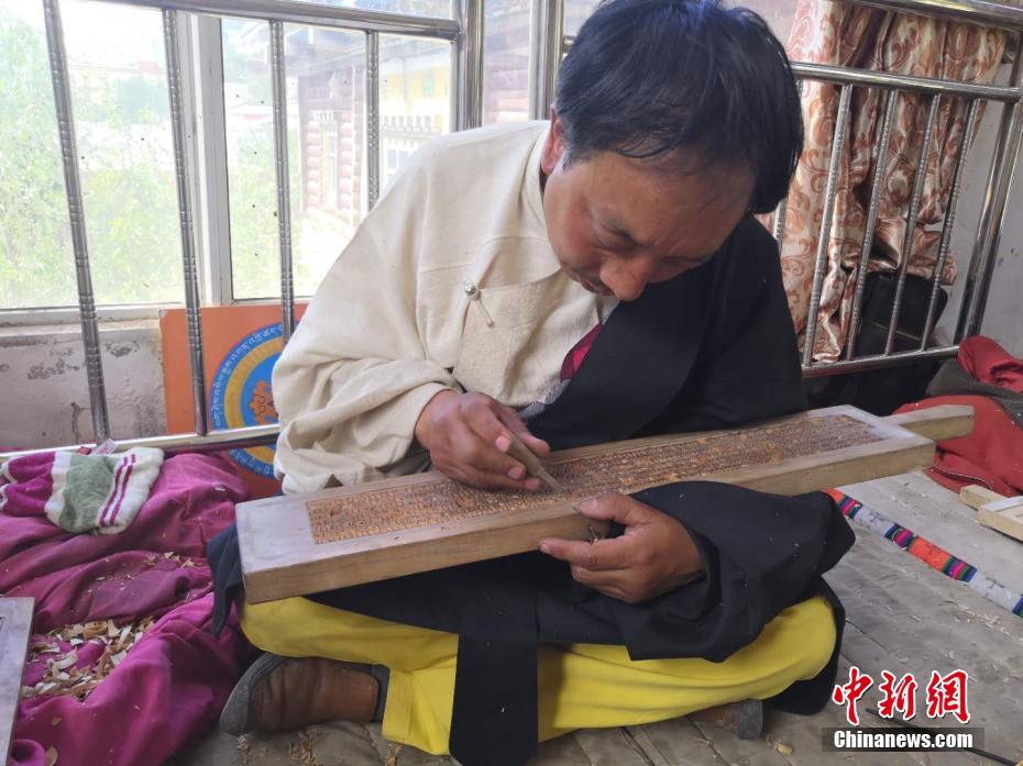 朗加有个心愿,就是要再刻一套完整的《甘珠尔》经,并把它留在村子里。据悉,刻完这部经需要刻3万余张木板。图为朗加在加工一块《甘珠尔》刻版。中新网记者 吉翔 摄