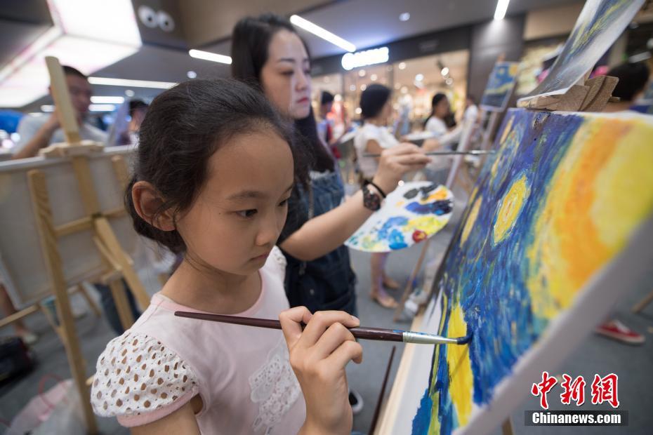 6月3日,山西太原北美N1艺术购物中心,150名画师共绘梵高著名油画作品《星月夜》。在参与创作的画师中,年龄最小的只有4岁,年龄最大的已经60岁。《星月夜》是荷兰后印象派画家文森特·威廉·梵高于1889年创作的一幅油画,是梵高的代表作之一,现藏纽约现代艺术博物馆。韦亮 摄
