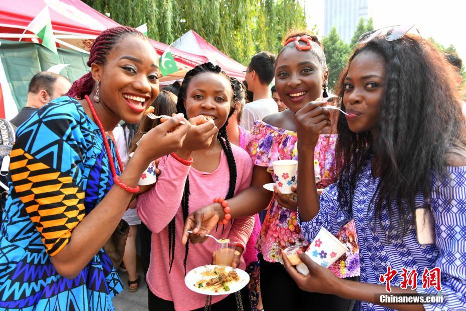 6月2日下午,河北师范大学国际文化交流学院第二届国际文化节举行,来自17个国家的留学生亲手制作的当地特色美食,吸引着过往的学生们。图为留学生们品尝美食。中新社记者 翟羽佳 摄