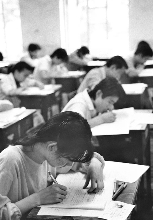 1989年7月7日,北京市第五中学的一个考场内,考生正在答题。1989年北京市共有34841人参加了文史、理工和外语3个科类的考试。(新华社记者 杜捷 摄)