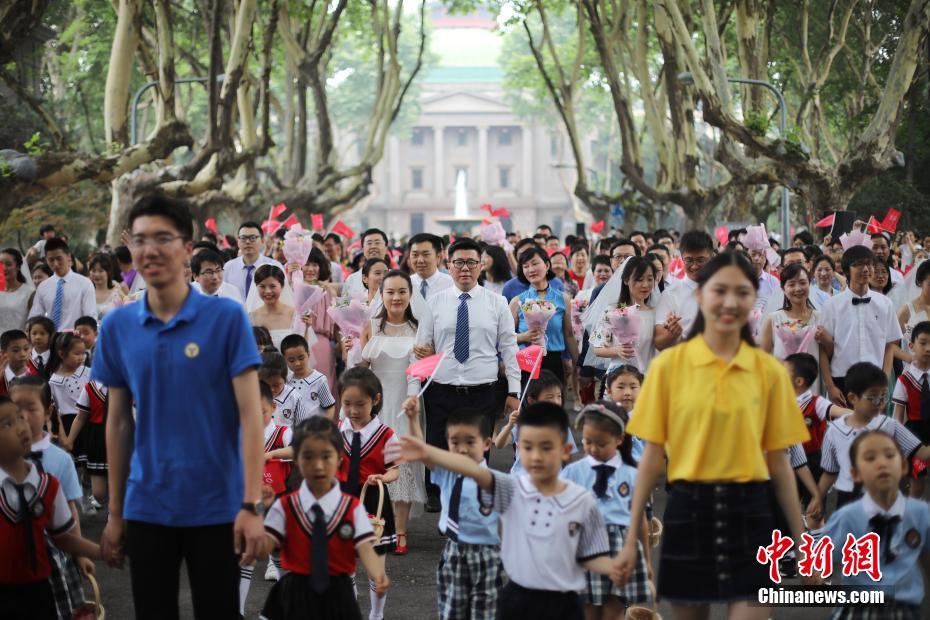 6月5日,从全国各地赶来的30对伉俪齐聚南京东南大学百年大礼堂前,在近千师生、海外留学生们的见证下,携手对母校“告白”,祝福该校复更名30周年、建校116周年华诞。据了解,这些伉俪中既有90多岁高龄、婚龄64年的“钻石婚夫妇”;也有即将步入婚礼殿堂的新婚夫妇;还有1984年考入“南京工学院”、1988年毕业于“东南大学”,经历、见证了学校复更名庆典的校友。南京东南大学是中国最早建立的高等学府之一,前身是创建于1902年的三江师范学堂,1921年正式建立国立东南大学,1928年改名为国立中央大学,1952年全国院系调整,在中央大学本部原址建立了南京工学院。1988年5月,学校复更名为东南大学。中新社记者 泱波 摄