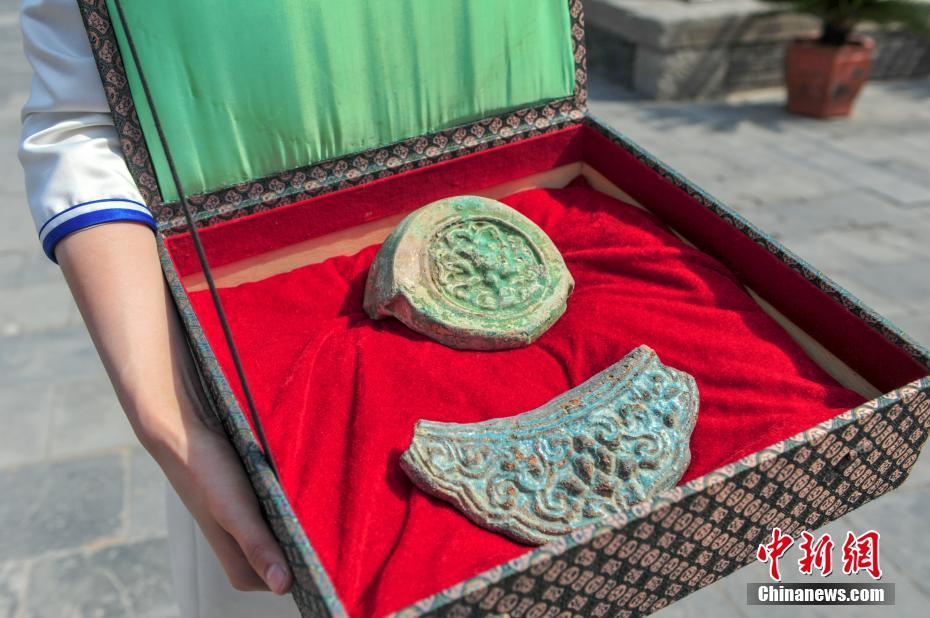 经双方交流洽谈,沈阳市文物考古研究所将这批珍贵文物资料计90件套正式移交给沈阳故宫博物院收藏。图为在交接仪式上交接的瓦当(上)、滴水(下)两件出土文物资料。 中新社记者 于海洋 摄