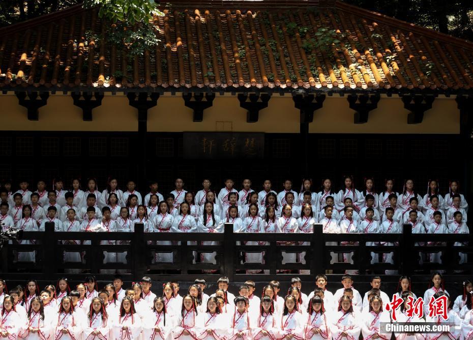 6月14日,湖北武汉百名中小学生齐声吟诵《离骚》选段。在端午节来临之际,湖北万名中小学生分别在武汉东湖、湖北宜昌、秭归、三峡坝区举办“长江楚风·大雅经心”——万人唱诵《楚辞·离骚》大型文化活动,传承弘扬中国传统文化和爱国主义精神。中新社记者 张畅 摄