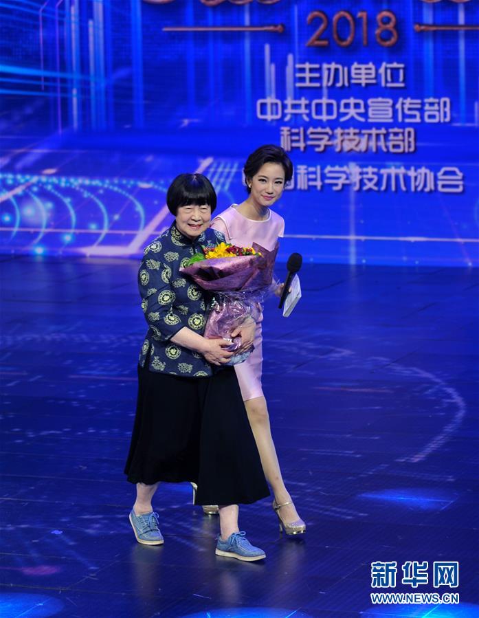 中国科学院古脊椎动物与古人类研究所研究员张弥曼(左)在主持人陪同下走上舞台(6月10日摄)。
