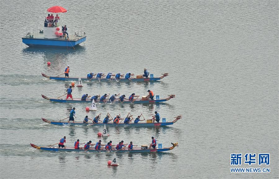 6月14日,参赛龙舟队伍在比赛中奋力争先。 新华社发(雷勇 摄)