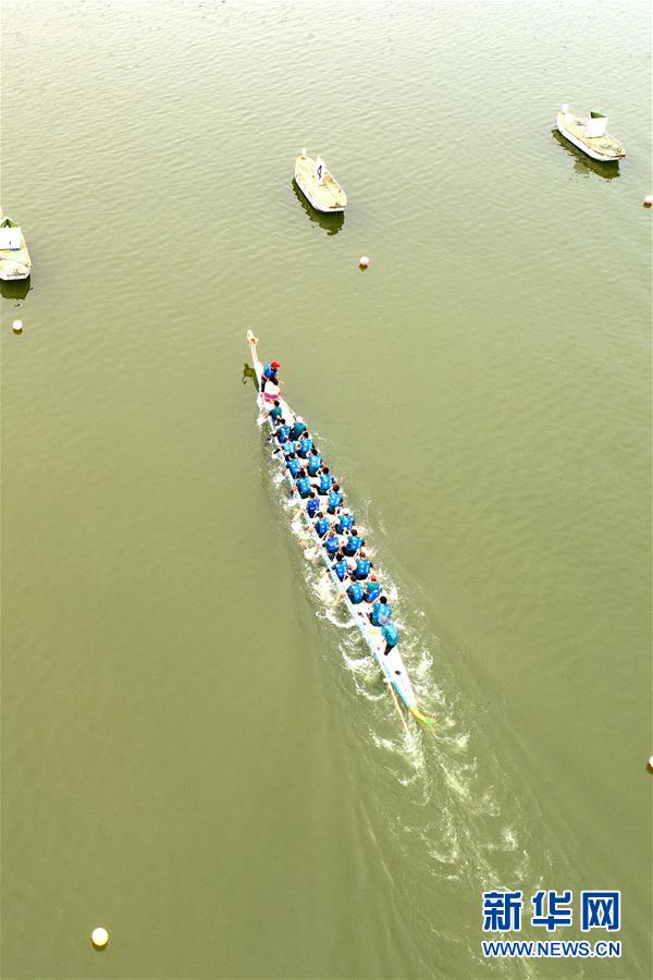 6月14日,一只龙舟向终点冲刺(无人机航拍)。 新华社发(王罡 摄)