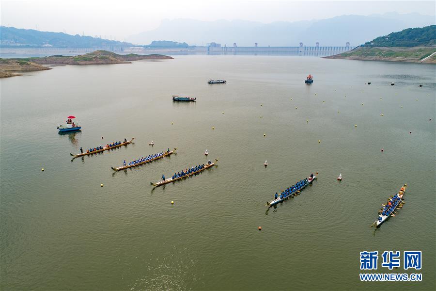 6月14日,参赛龙舟在赛道上准备开赛。 新华社发(王罡 摄)