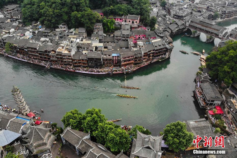 湖南凤凰古城吊脚楼下百年龙舟赛迎端午