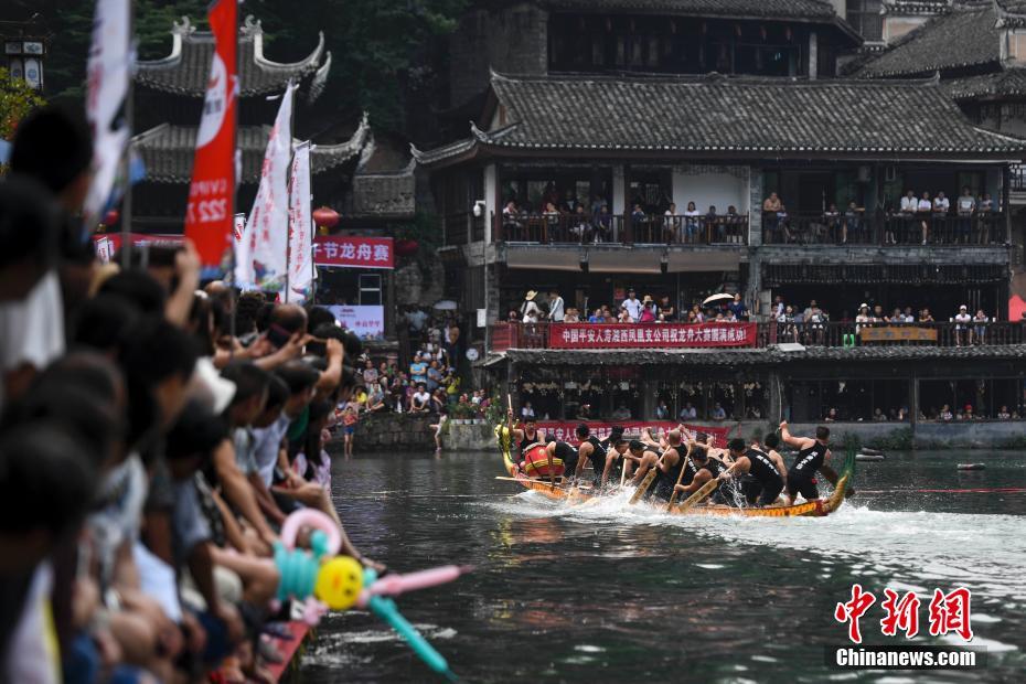 湖南凤凰古城吊脚楼下百年龙舟赛迎端午