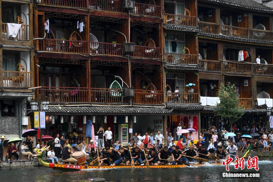 湖南凤凰古城吊脚楼下百年龙舟赛迎端午