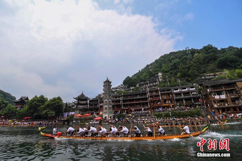 湖南凤凰古城吊脚楼下百年龙舟赛迎端午