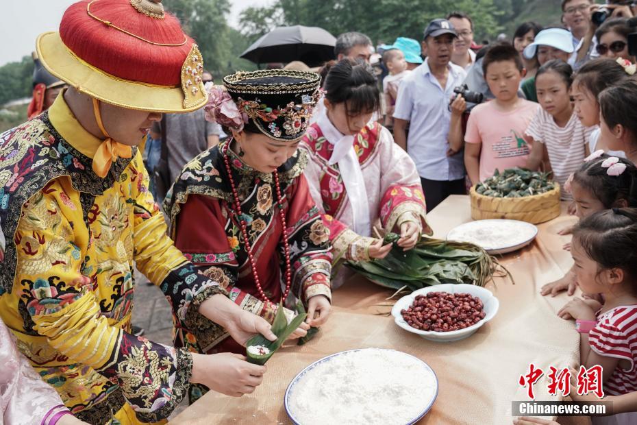 6月18日,农历五月初五,圆明园举行龙舟表演赛、包粽子等系列活动庆祝端午佳节。图为身着皇家服装的工作人员在圆明园万方安和景区为游客包粽子。中新社记者 崔楠 摄