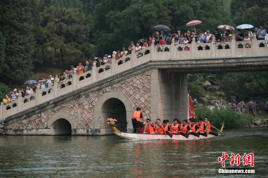6月18日,农历五月初五端午节,圆明园邀请圆明园志愿者龙舟队与中央民族大学龙舟队在园内最大的水面区域福海进行龙舟表演赛。据了解,早在清朝时期,每逢端午圆明园也会在福海西部举行龙舟竞渡,以此纪念中国传统端午节的到来。图为中央民族大学龙舟队在圆明园福海划行。中新社记者 崔楠 摄