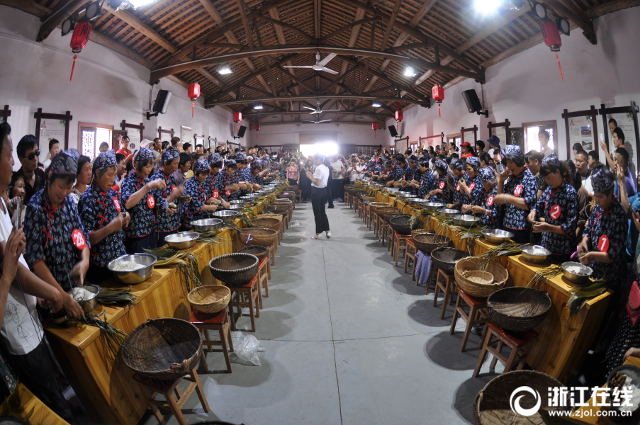6月18日,磐安县横路村古街举行千人宴,有包粽子比赛、品粽子、点雄黄、佩香囊等活动,吸引了上万名游客参加,享用美味丰盛的农家美食和粽子。(浙江在线拍友 孔德宾 摄)