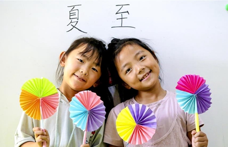 6月21日,南昌县塔城乡中心小学的戏曲老师(前左一)为孩子们做采茶戏的动作示范。
