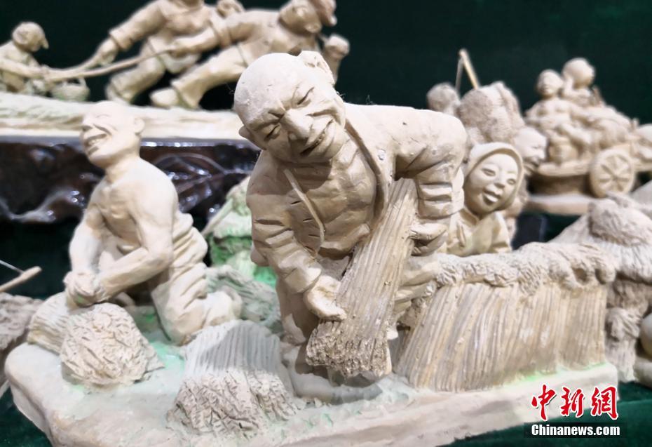 在一间十几平米小房间内,桌子上、架子上,到处摆满惟妙惟肖的“小泥人”,打梿椵、收麦子、庆丰收等农耕场景,被这些“小泥人”表现得活灵活现。甘肃临夏民间艺人常天平从事泥塑制作已有三十余年,如今他是甘肃省工艺美术大师。多年来,他一共制作1700多件泥塑作品,取材立意广泛,包括戏剧脸谱、民间传说、历史故事、乡俗生活等,传承发扬中国传统文化。图为泥塑作品展示拔麦子。 刘玉桃 摄