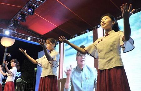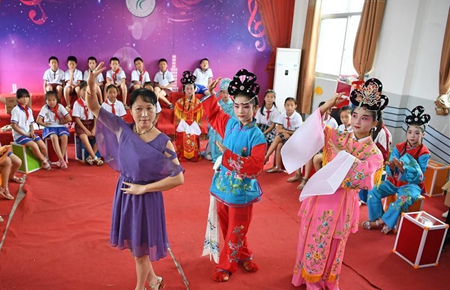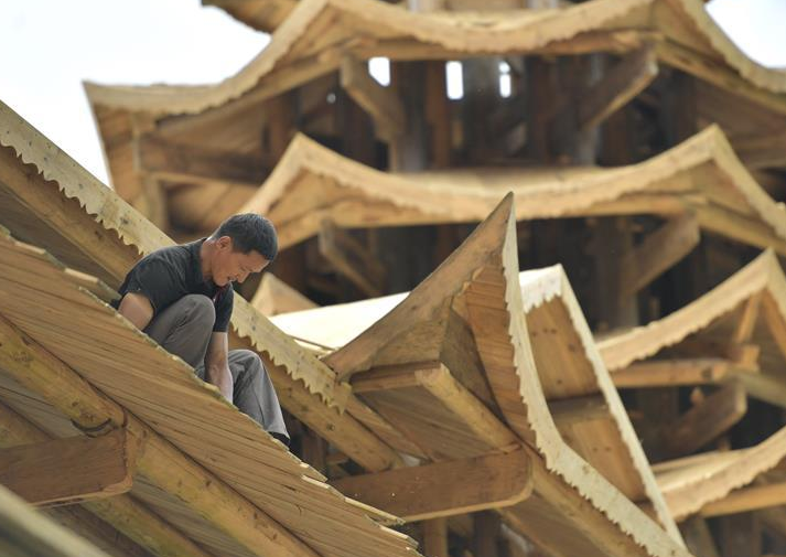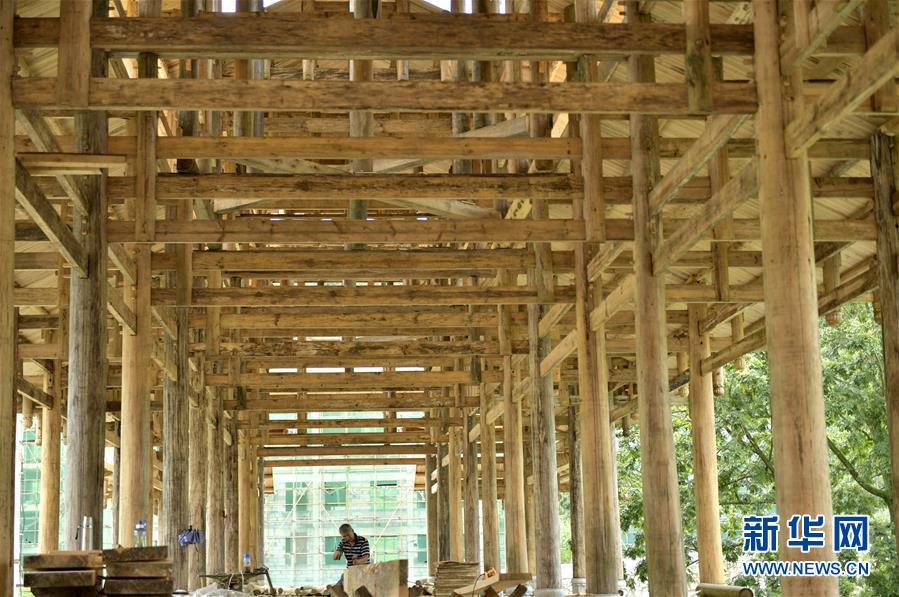 6月22日,工人在湖北省宣恩县高罗镇龙河村修建风雨桥。