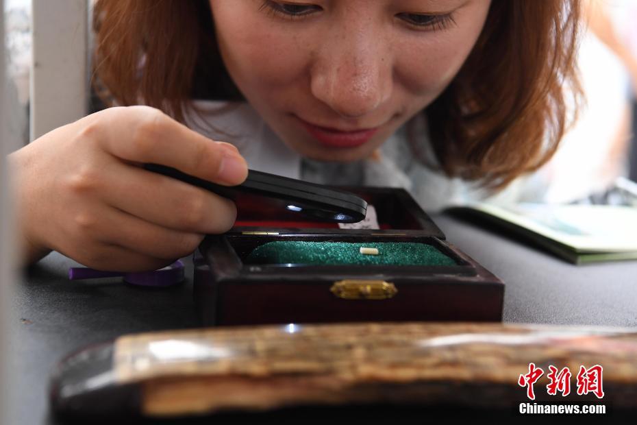 民众用放大镜观看毛发上刻的字体。 陈超 摄