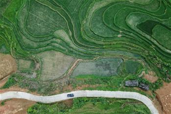 6月25日拍摄的榕江县八开镇摆奶村乌娘溪梯田(无人机拍摄)。仲夏时节,贵州省榕江县八开镇摆奶村乌娘溪梯田绿意盎然,美不胜收。 新华社记者 欧东衢 摄