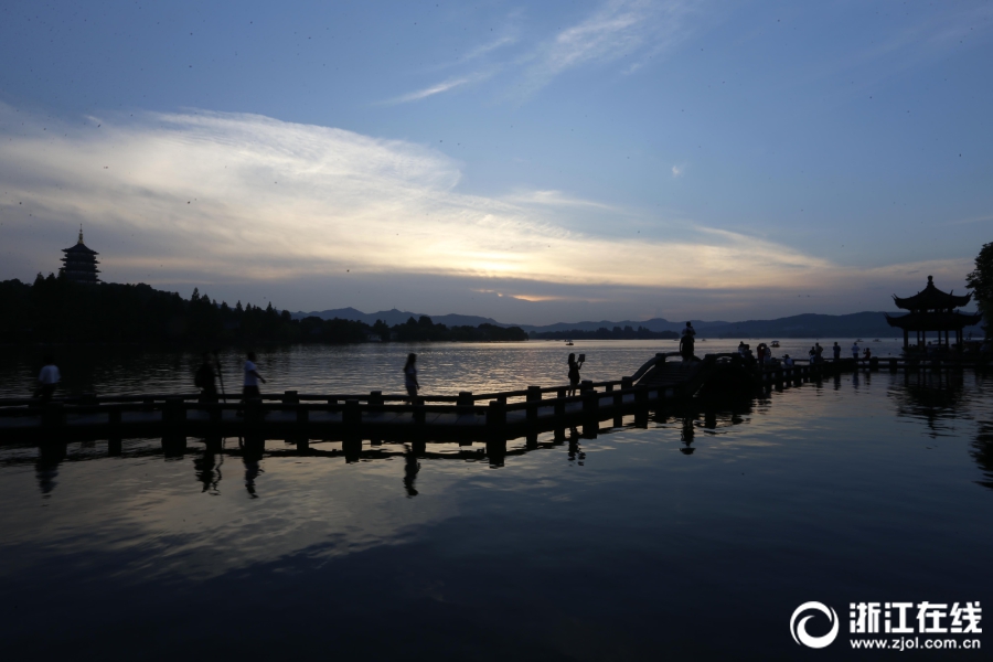 6月25日,杭州最高气温达到了36.3℃。西湖景区成了摄影天堂。在长桥公园,许多摄影爱好者提前来此守候,拍摄“雷峰夕照”美景。(浙江在线记者 吴煌 摄)