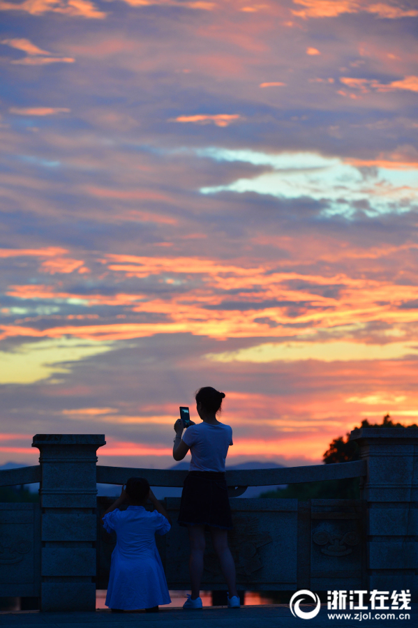 6月27日,晚霞把杭州的天空映得彤红。俗话说“朝霞不出门,晚霞行千里”,浙江省气象台预报,28日全省将继续维持晴热天气。(浙江在线记者 徐彦 摄)