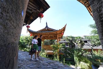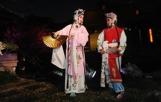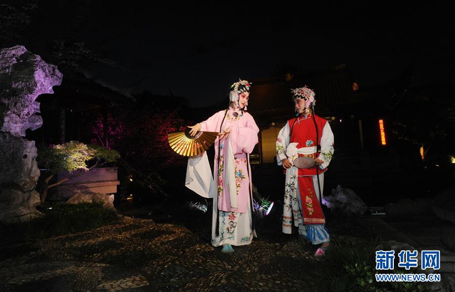 当晚,《水月山塘》实景演出首次亮相江苏苏州古山塘。《水月山塘》是实景化、体验型的苏州风情文化项目,融合苏州园林实景、苏州地方曲艺舞蹈等,结合灯光音响和舞台效果,让观者体验苏州文化的独特魅力。新华社发(杭兴微 摄)