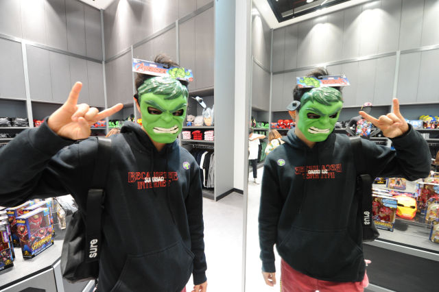 6月27日,在泰国漫威基地内,一名漫威粉丝戴着绿巨人面具。