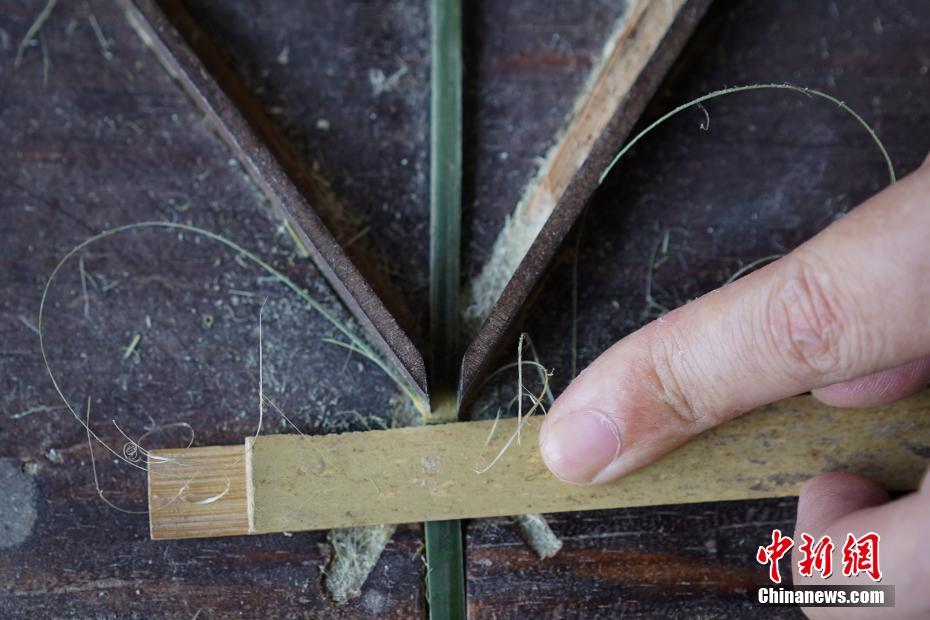 7月11日,贵州省三穗县,杨杜鹃在“匀刀”上反复加工所需的篾条。杨杜鹃是贵州省黔东南苗族侗族自治州三穗县人,2014年她怀着振兴三穗县竹编工艺的梦想,辞掉工作返乡,带领三穗县界牌村的竹编艺人一起创业。三年来,杨杜鹃的公司共培训当地农民竹编工艺者300多人,通过公司+农户的订单式生产模式,通过网络平台,所生产的竹编产品年销售额达百万元,使当地与公司合作的农户实现脱贫增收。2018年,应长期合作客户对竹编二维码的需求,杨杜鹃经过创新,将时下流行的各类二维码图案通过传统的竹编技艺来呈现,经过几次技术改良后,二百元一个的竹编二维码上市后受热捧。 中新社记者 贺俊怡 摄