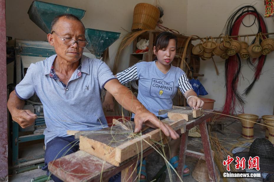 7月11日,贵州省三穗县,今年65岁的竹编艺人杨光伦在给杨杜鹃削特供的竹篾条,因客户对竹编产品质量的要求,杨杜鹃在选材和篾条的加工上,亲力亲为。杨杜鹃是贵州省黔东南苗族侗族自治州三穗县人,2014年她怀着振兴三穗县竹编工艺的梦想,辞掉工作返乡,带领三穗县界牌村的竹编艺人一起创业。三年来,杨杜鹃的公司共培训当地农民竹编工艺者300多人,通过公司+农户的订单式生产模式,通过网络平台,所生产的竹编产品年销售额达百万元,使当地与公司合作的农户实现脱贫增收。2018年,应长期合作客户对竹编二维码的需求,杨杜鹃经过创新,将时下流行的各类二维码图案通过传统的竹编技艺来呈现,经过几次技术改良后,二百元一个的竹编二维码上市后受热捧。中新社记者 贺俊怡 摄