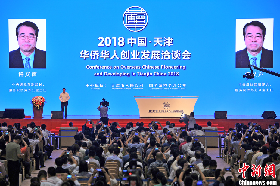 7月13日,由天津市人民政府、中国国务院侨务办公室联合主办的2018中国·天津华侨华人创业发展洽谈会暨世界侨商项目与商品博览会在天津梅江会展中心启幕。图为中央统战部副部长、国务院侨务办公室主任许又声出席开幕式并致辞。中新社记者 佟郁 摄
