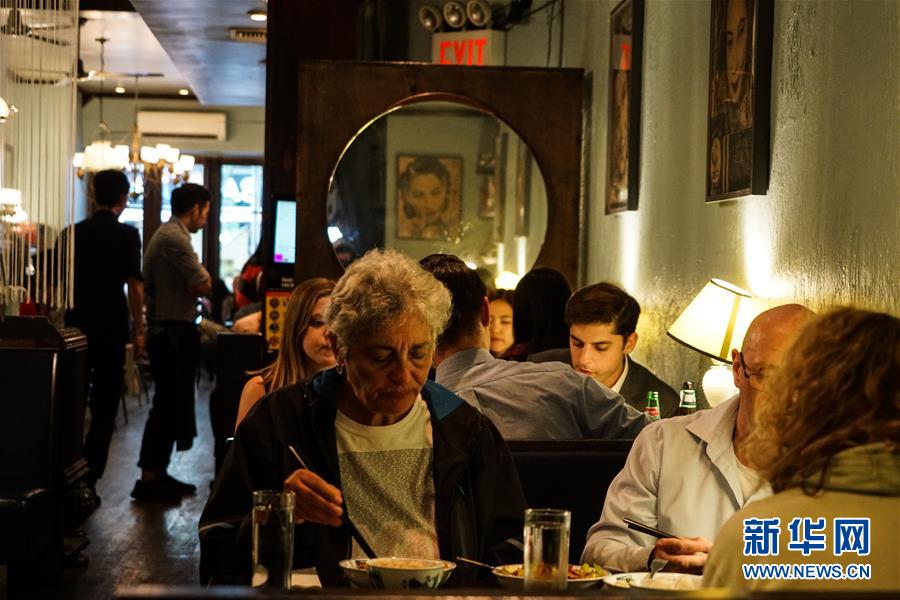 这是食客们在位于美国纽约的“倾城”餐厅享用晚餐(6月27日摄)。