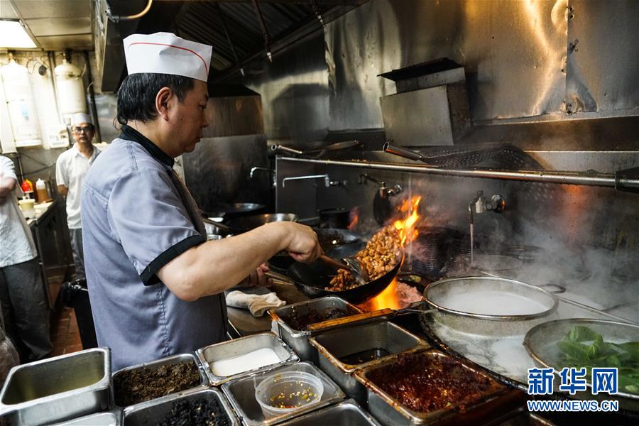 这是在位于美国纽约的“倾城”餐厅,一名厨师在后厨烹炒宫保鸡丁(6月27日摄)。