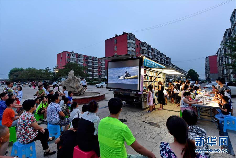 7月16日,唐山市丰南区金都花园社区的居民在欣赏流动服务车上播放的电影。 新华社记者 杨世尧摄