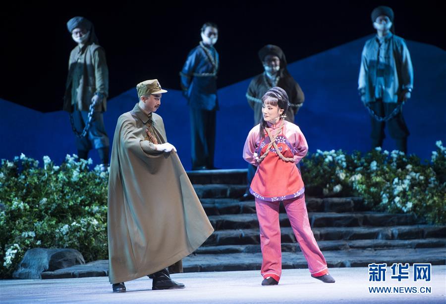 7月18日,演员杨俊(右)在《党的女儿》中饰演田玉梅。 当日,改编自同名歌剧的现代黄梅戏《党的女儿》在武汉首演。该歌剧由湖北省戏曲艺术剧院联袂鄂皖两省戏剧名家通力打造,包括国家一级作曲徐志远、安徽省黄梅戏剧院主胡演奏家李万昌、国家一级编剧宋西庭、国家一级导演邓德森等。 新华社记者 肖艺九 摄