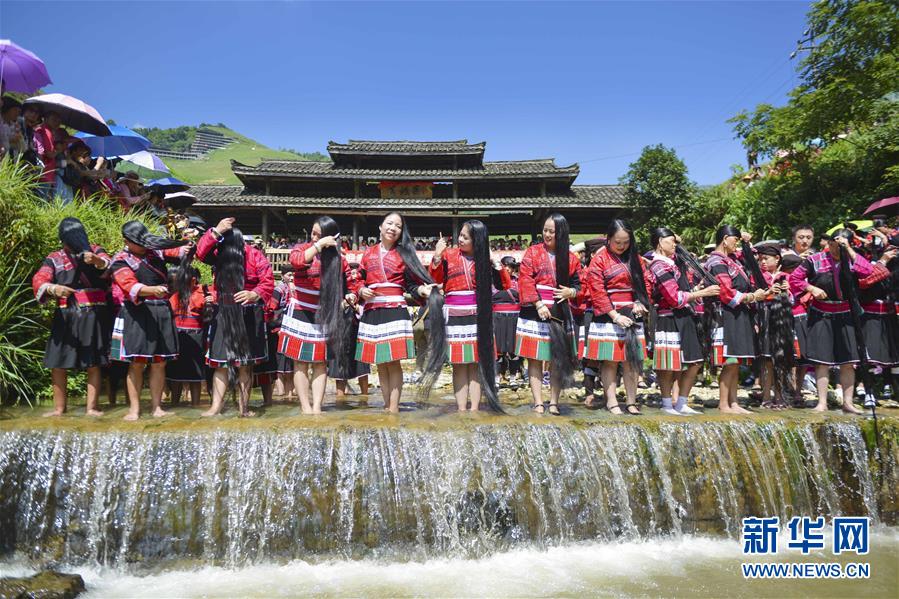 7月18日,在广西龙胜各族自治县龙脊镇大寨村,瑶族妇女在晒衣节上梳长发。 当日是农历六月初六,广西龙胜各族自治县龙脊镇大寨村举办一年一度的晒衣节。多姿多彩的特色活动吸引众多中外游客前来领略当地民族风情。 新华社发(潘志祥 摄)
