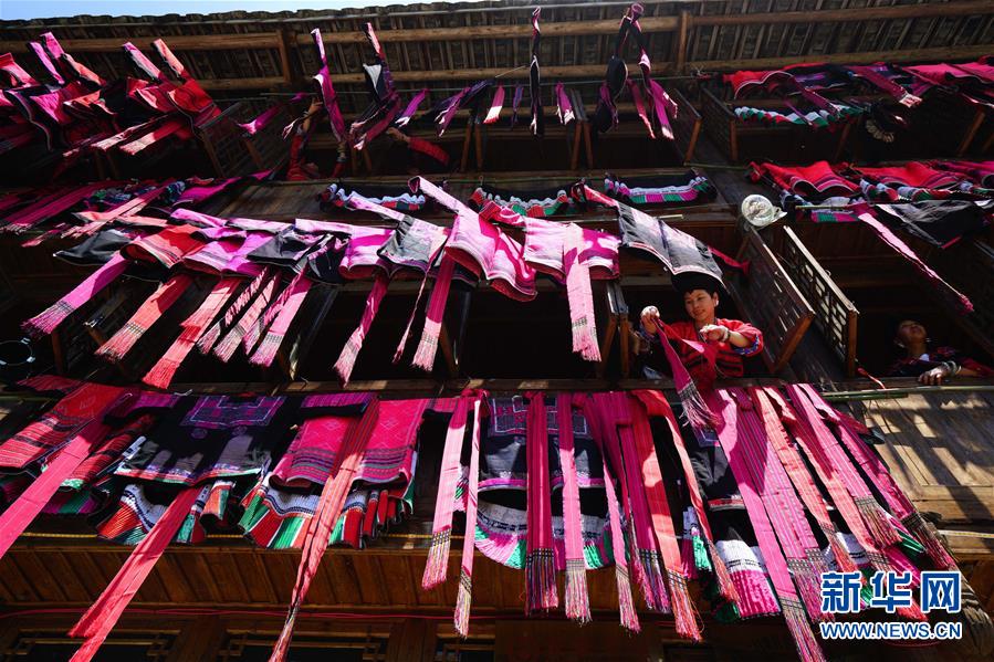 7月18日,在广西龙胜各族自治县龙脊镇大寨村,瑶族妇女在吊脚楼上晾晒花衣花裙。 当日是农历六月初六,广西龙胜各族自治县龙脊镇大寨村举办一年一度的晒衣节。多姿多彩的特色活动吸引众多中外游客前来领略当地民族风情。 新华社发(黄勇丹 摄)