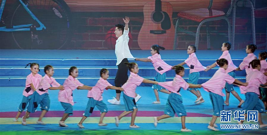 7月18日,西南科技大学文艺支教志愿者与武都区吉石坝小学学生在慰问活动上表演情景舞蹈《大山课堂》。新华社记者 才扬摄