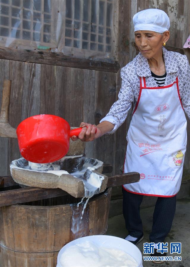 7月19日,在湖北恩施土家族苗族自治州宣恩县晓关侗族乡黄草坝村,村民在用石磨将黄豆磨成合渣浆。 新华社发(王俊 摄)
